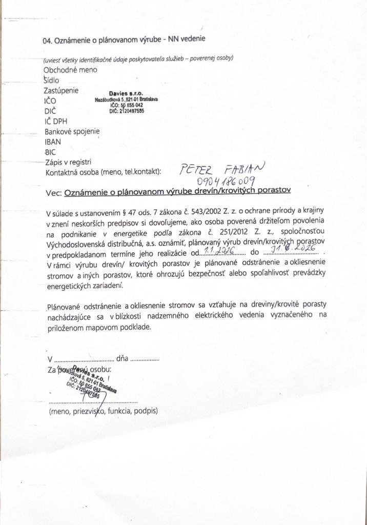 Upozorňujeme Vás na povinnosť udržiavať porasty v ochrannom pásme vedení a pod vedením maximálne do výšky 3 m od zeme. Zároveň je potrebné udržiavať bezlesie v šírke 4 m po oboch stranách elektrického vedenia.